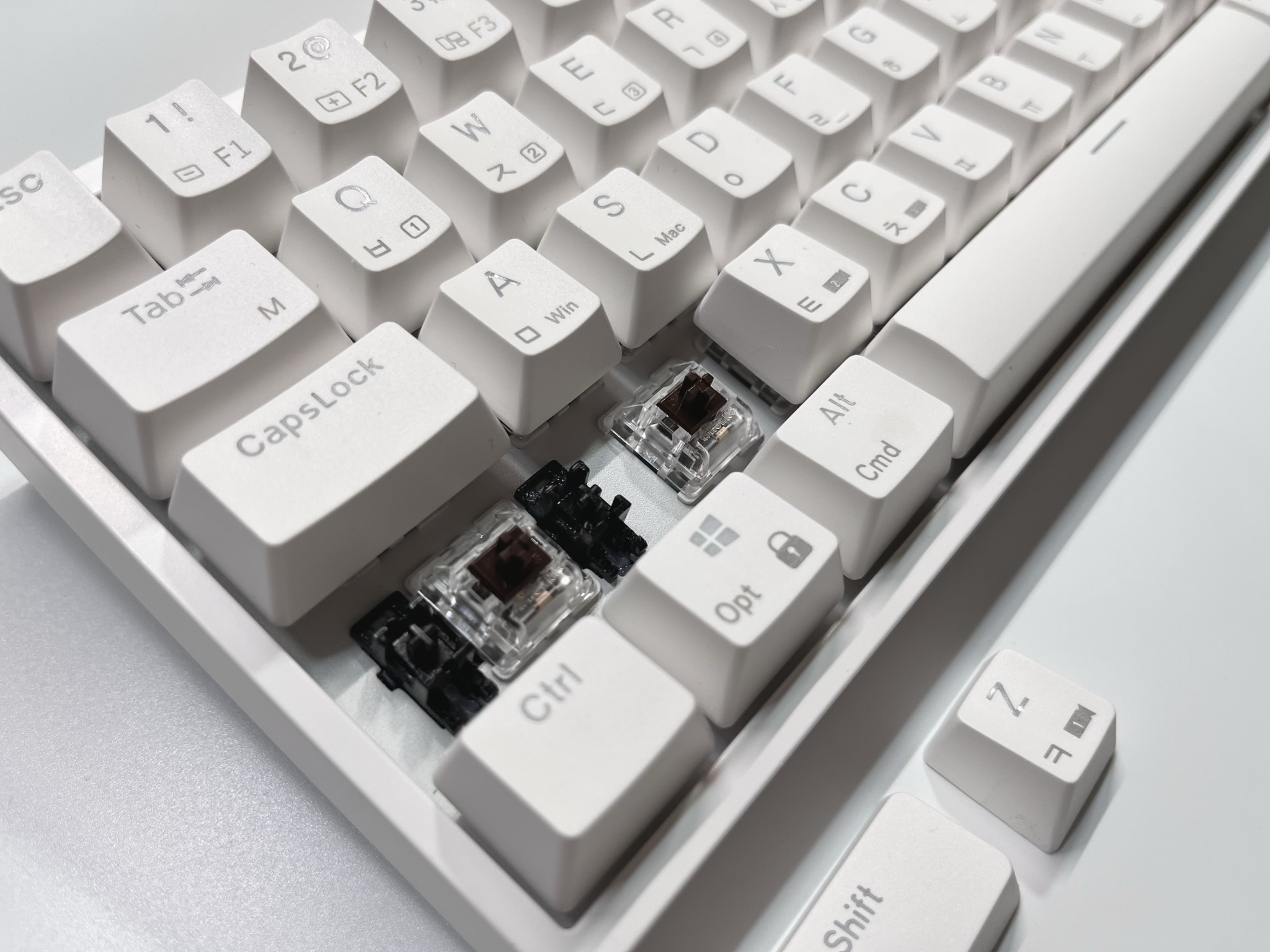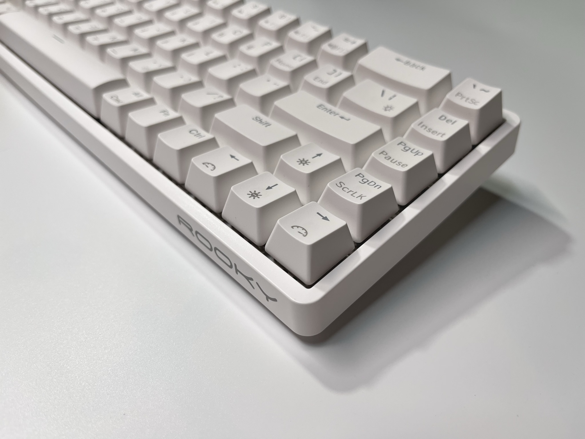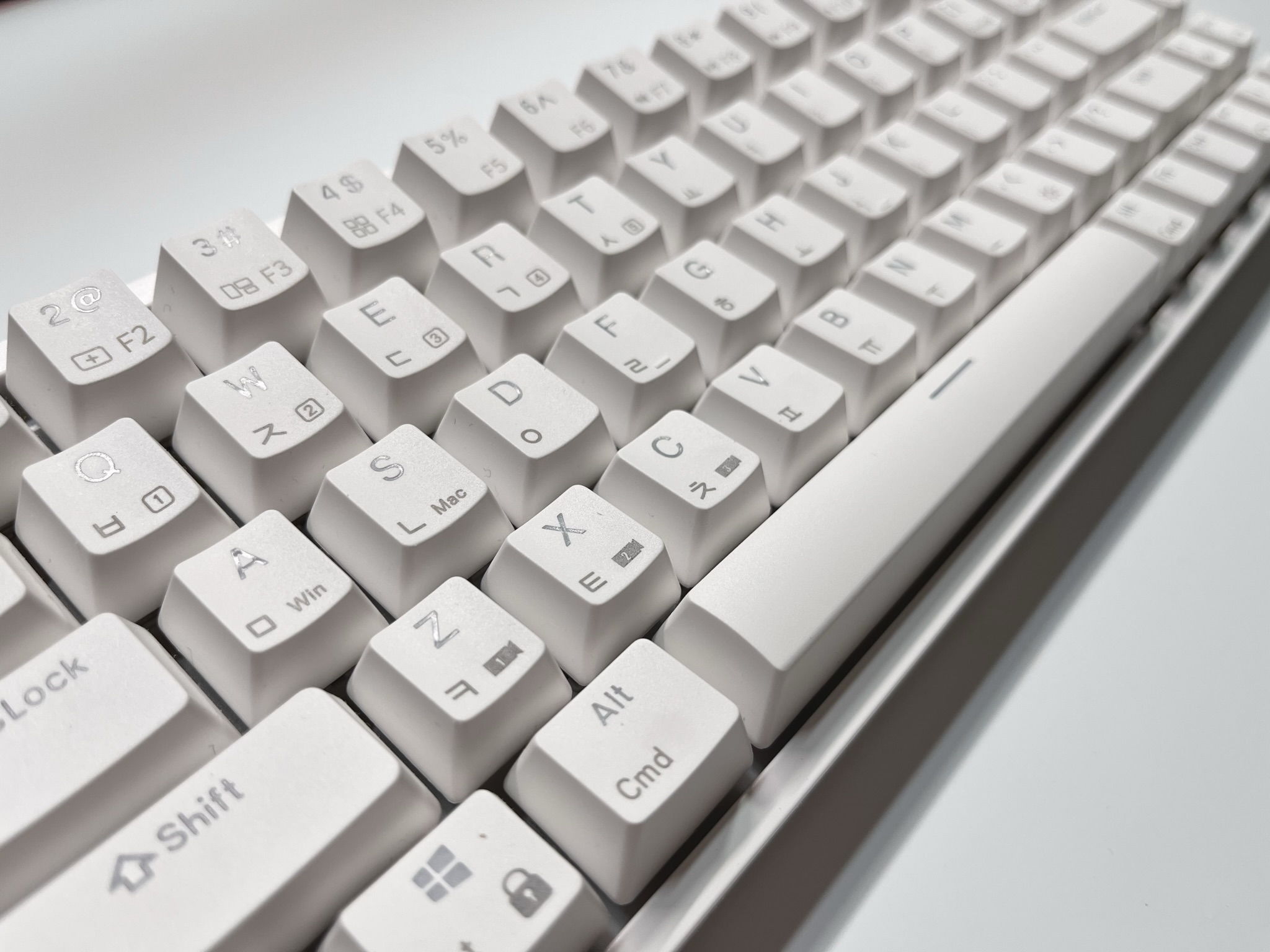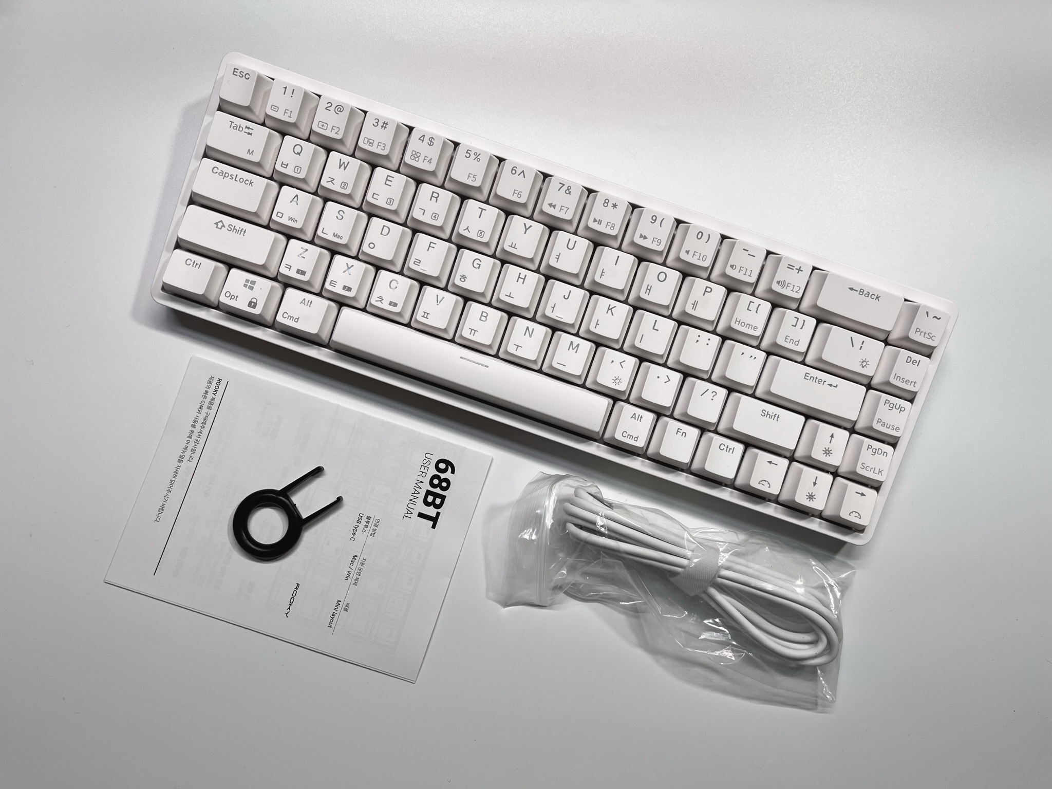전체적으로 화이트톤으로 만들어져 있으며, 키캡에 기능키들이 프린팅이 되어 있습니다. 68배열의 미니배열이기 때문에 많은 기능을 한번에 담을 수 없기에 Fn키와 다른키들을 조합해서 사용하실 수 있습니다.