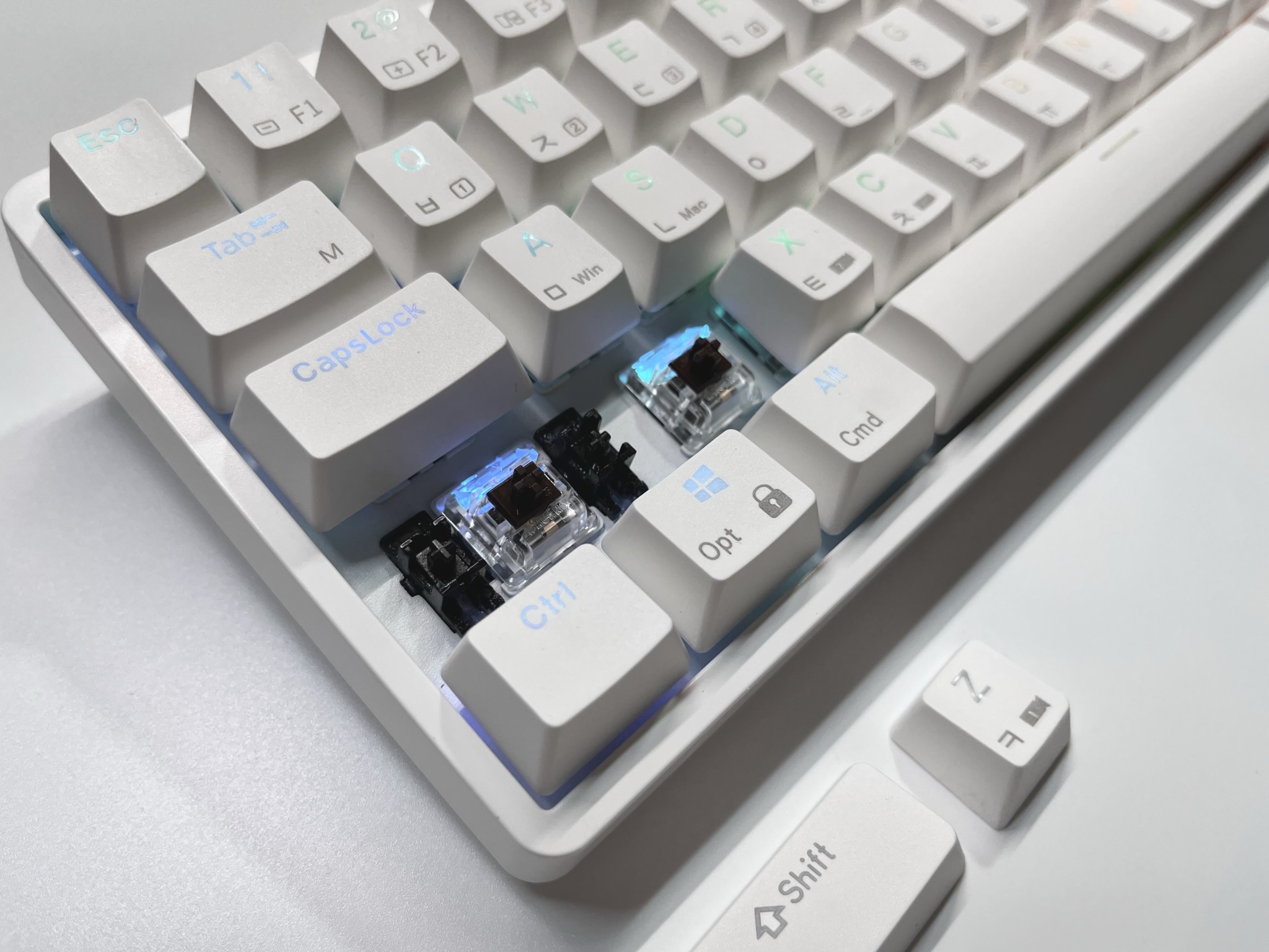 스위치의 재질은 폴리카보네이트로 RGB의 투과율을 높이기 위해서 채용했다고 볼 수 있습니다. 또한 역방향으로 체결되는 방식이기 때문에 일부 높이의 키캡(체리등)과는 호환이 어려우나, 상단투과 방식의 키캡과는 조합이 좋습니다.
