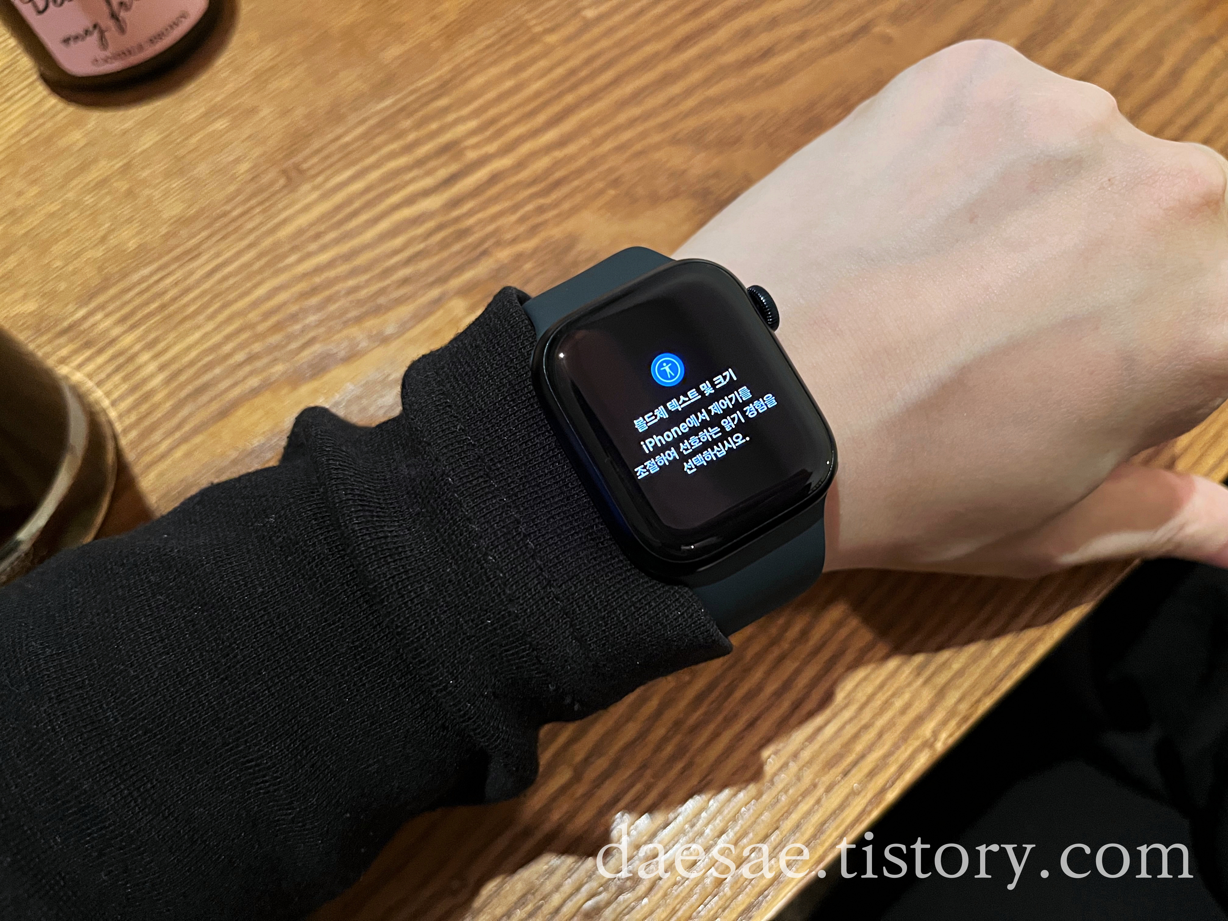 애플워치 8 미드나이트 41mm 알루미늄 모델 착용한 모습입니다.