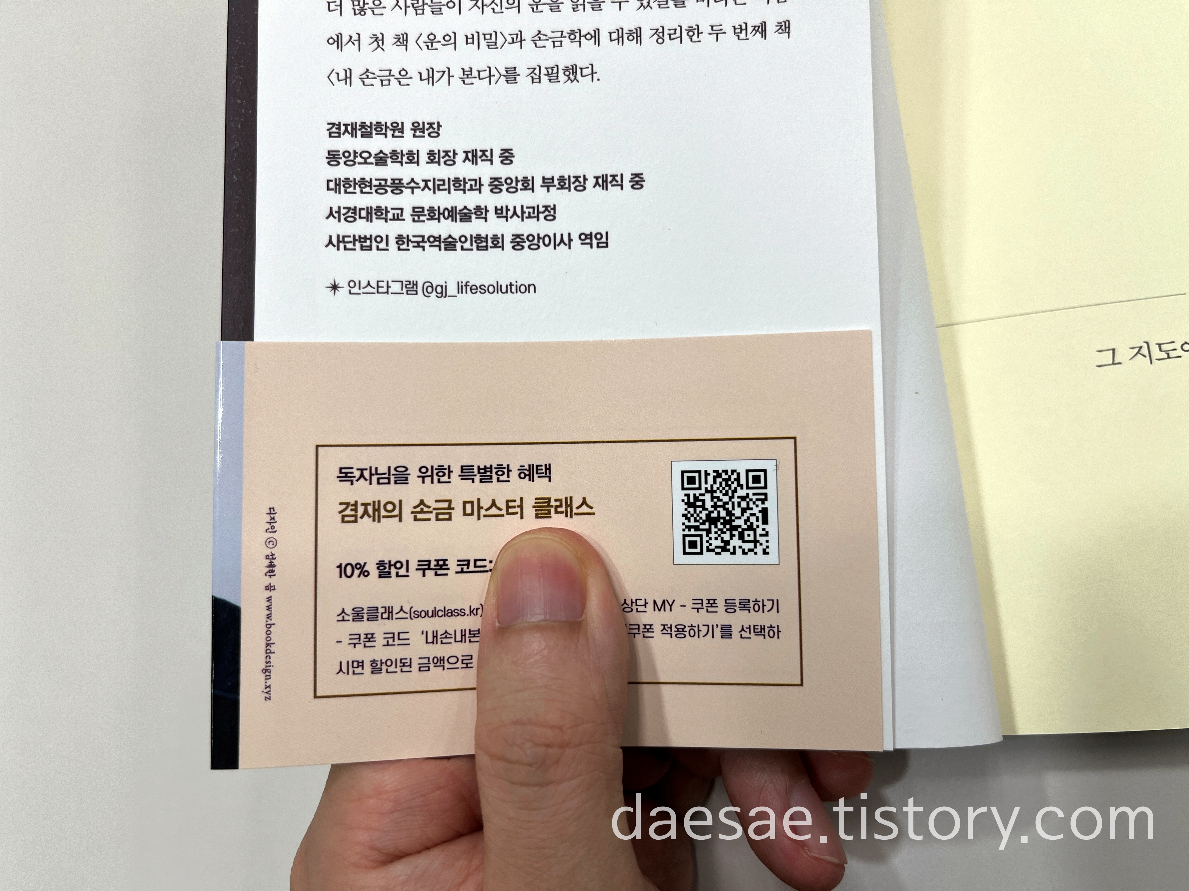 책을 구매한 사람들에게 손금 마스터클래스 10% 할인 쿠폰코드도 제공됩니다.