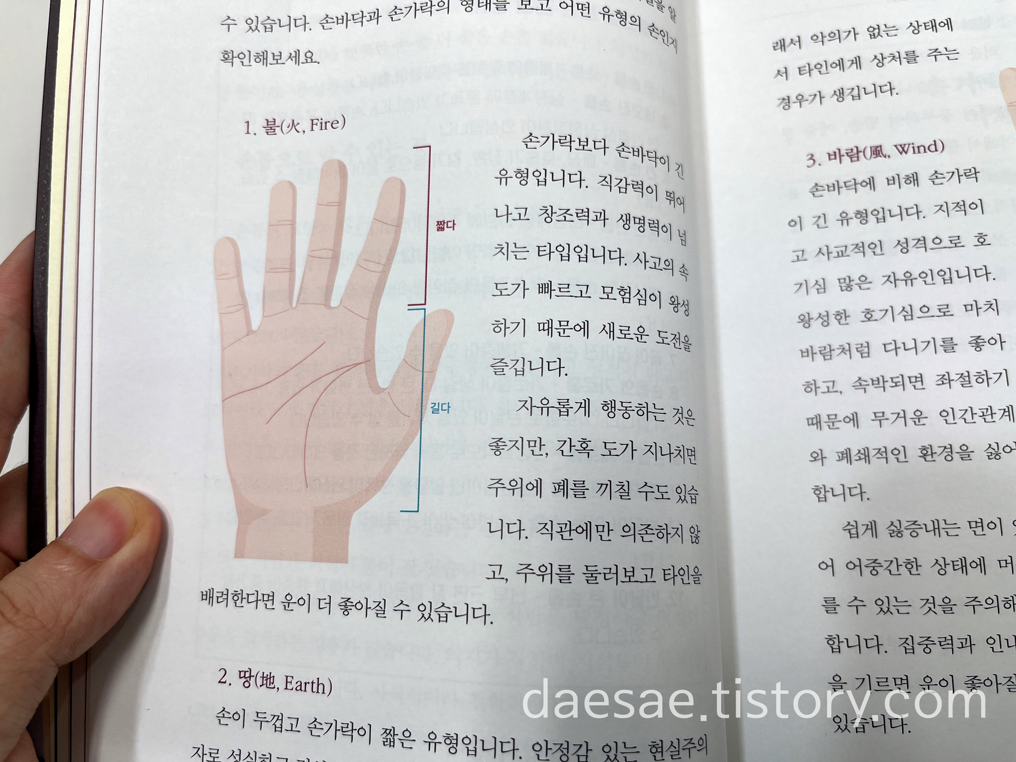 손가락과 손바닥의 형태를 보고 불, 땅, 바람, 물 등으로 유형을 나눌 수 있다는 점도 재미있네요.