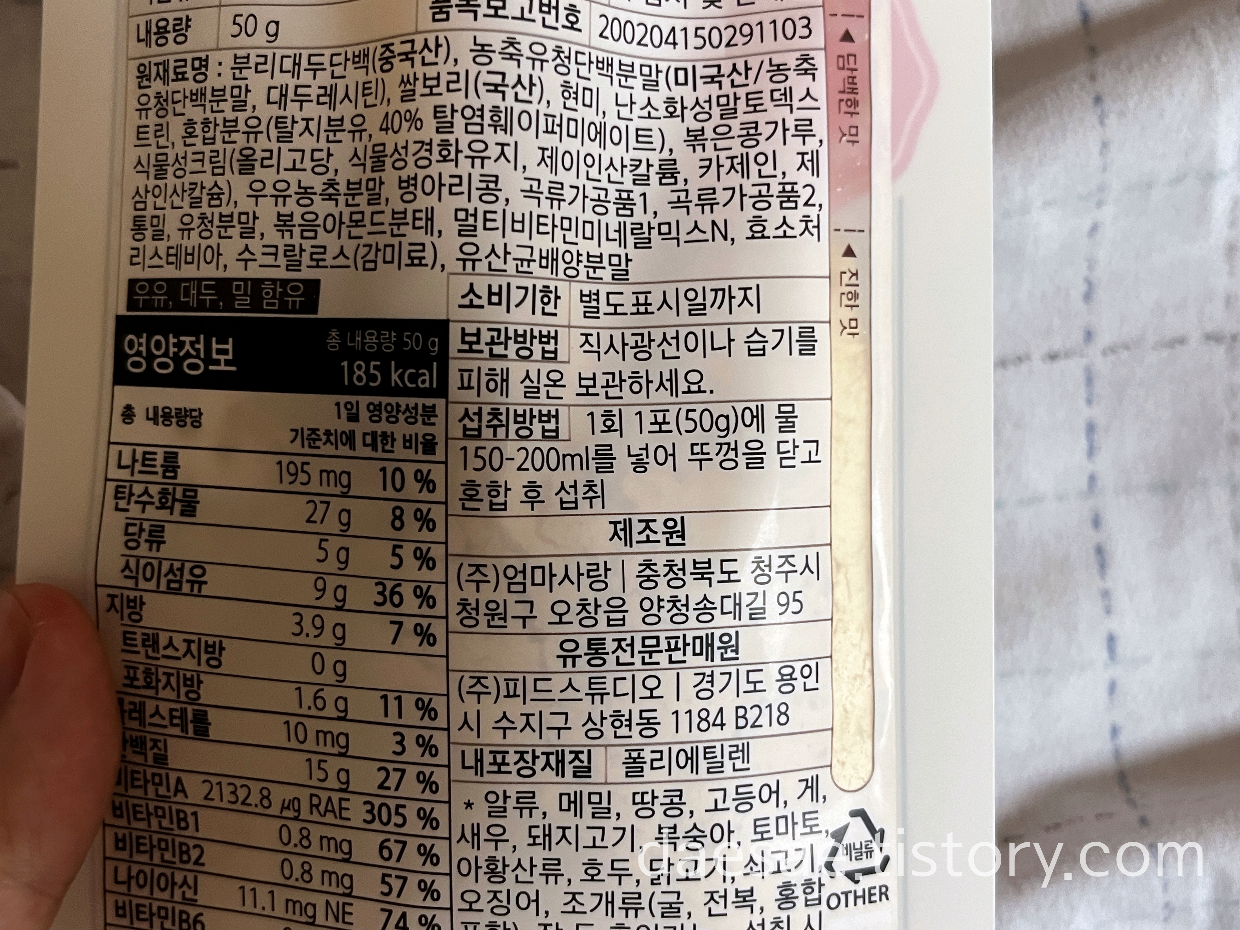 게다가 185kcal로 저칼로리 식품이며 물만 넣어 섞어먹기때문에 칼로리가 더 늘어날 일이 없다는 점도 좋습니다.