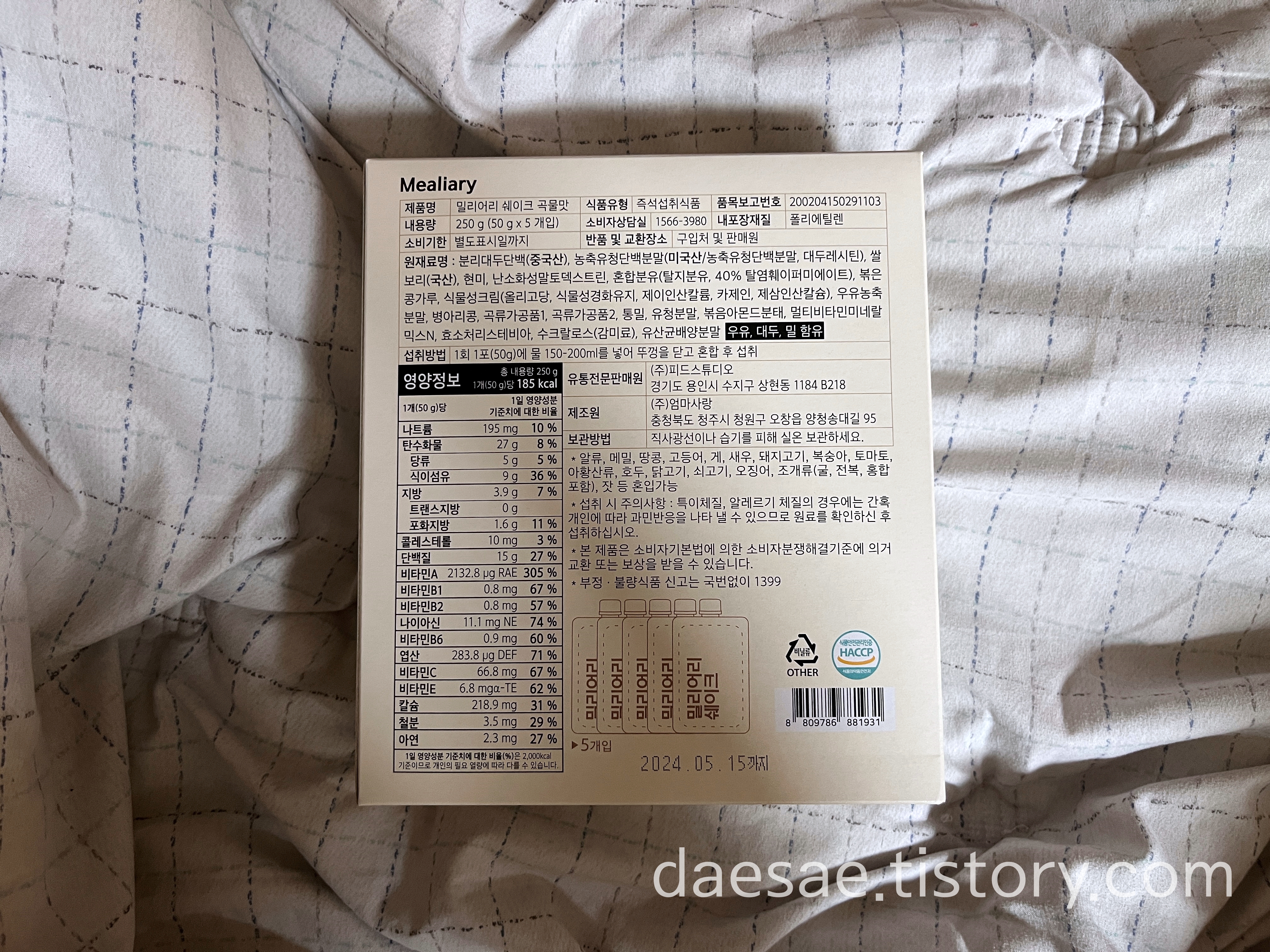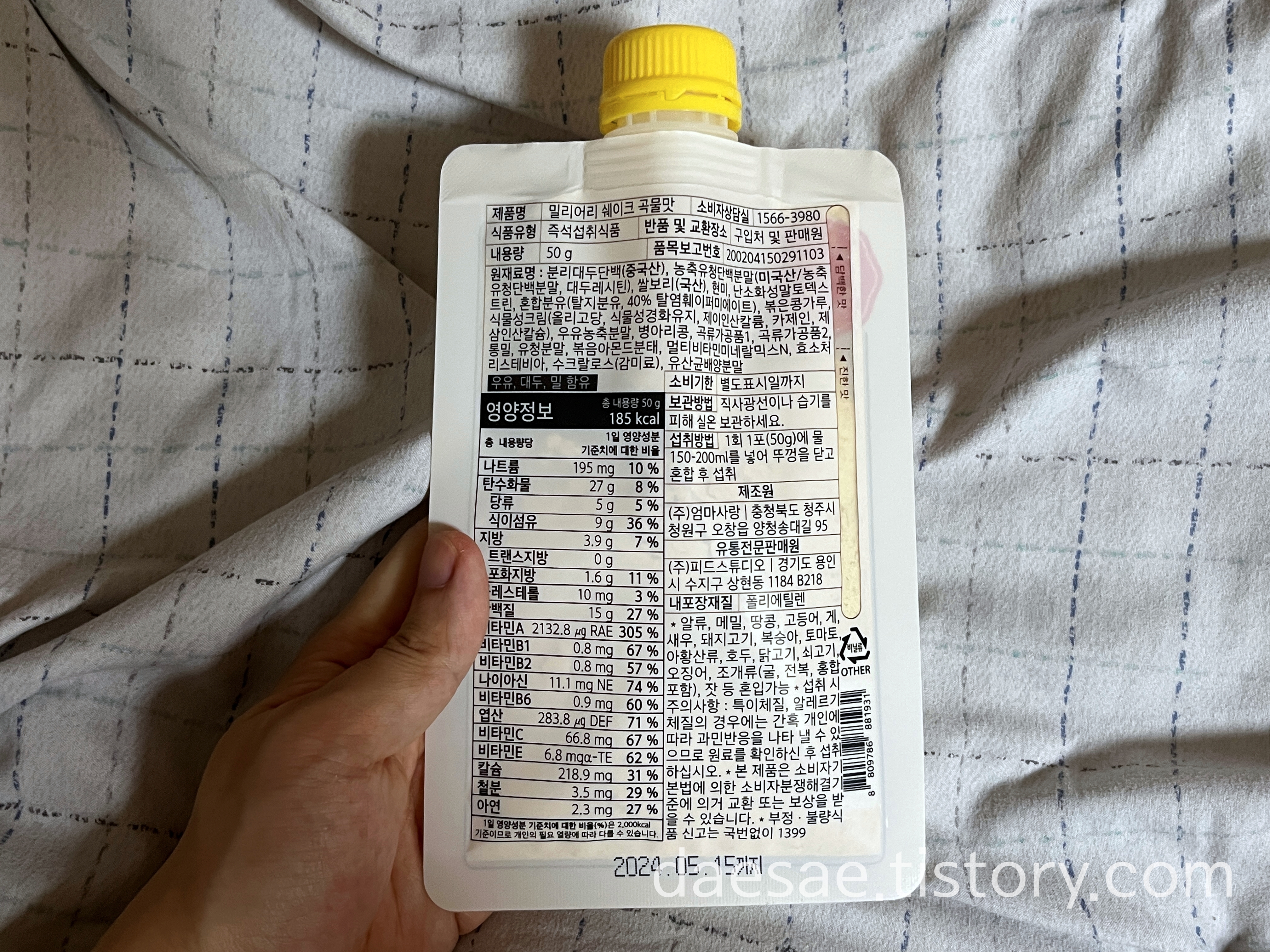 밀리어리쉐이크 곡물맛 뒷면에는 원재료 및 영양정보, 보관방법, 섭취방법 등이 기재되어있습니다.