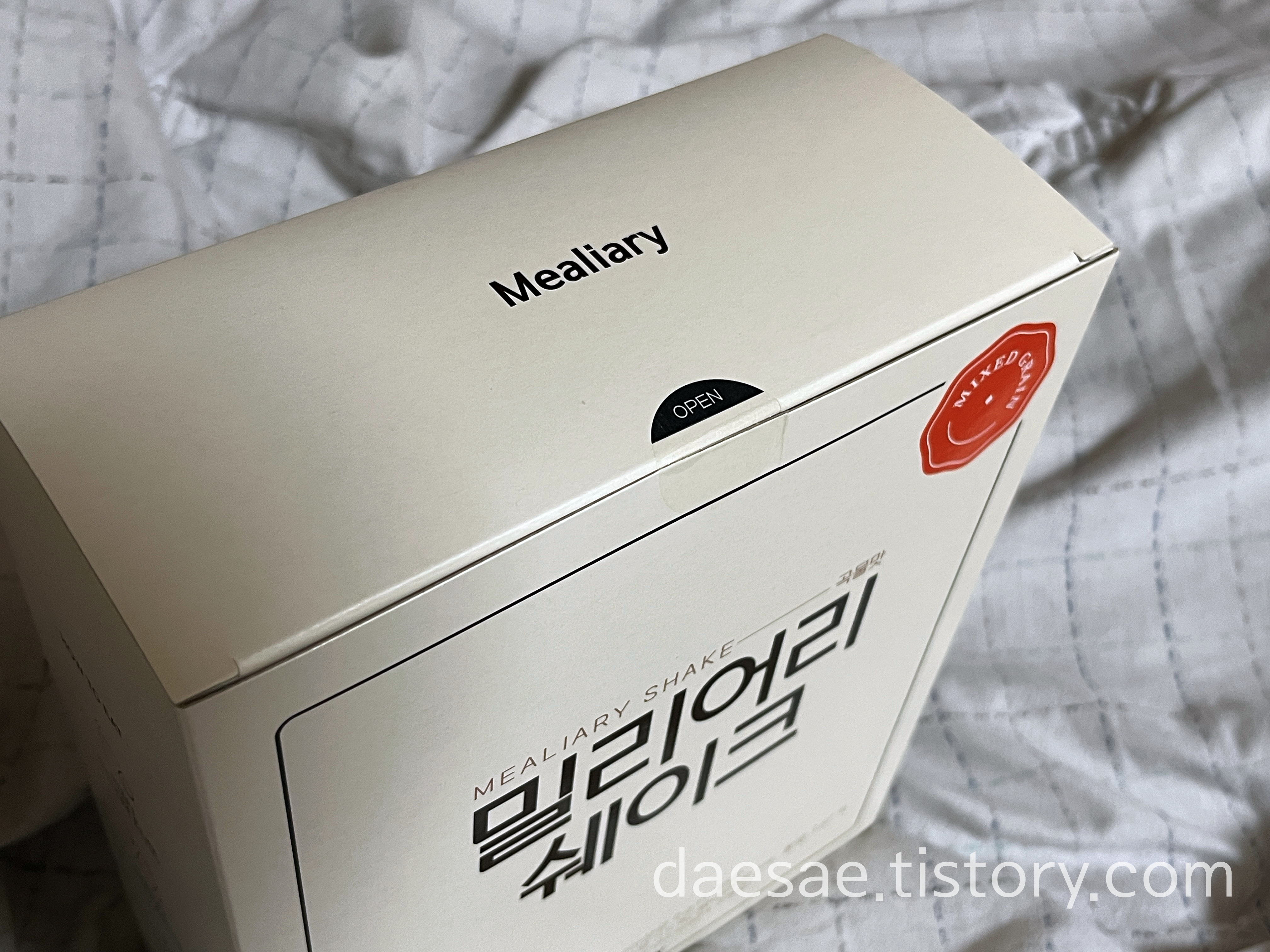 밀리어리 쉐이크 곡물맛 박스 상단부에는 OPEN 테이프로 봉인되어있습니다.