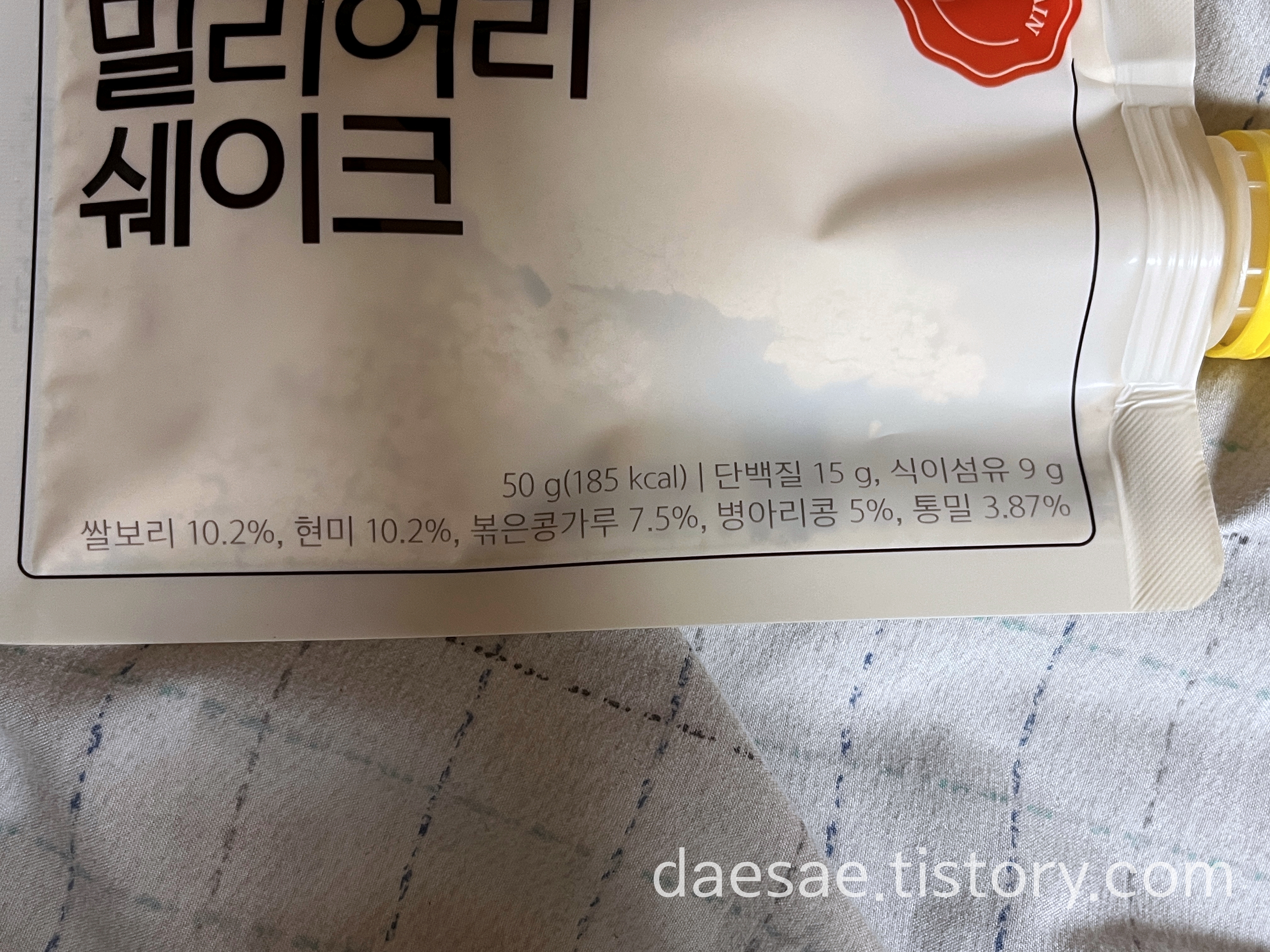 밀리어리 쉐이크 한 팩당 단백질 15g, 식이섬유 9g이 들어있다는게 참 좋은 점 같습니다.