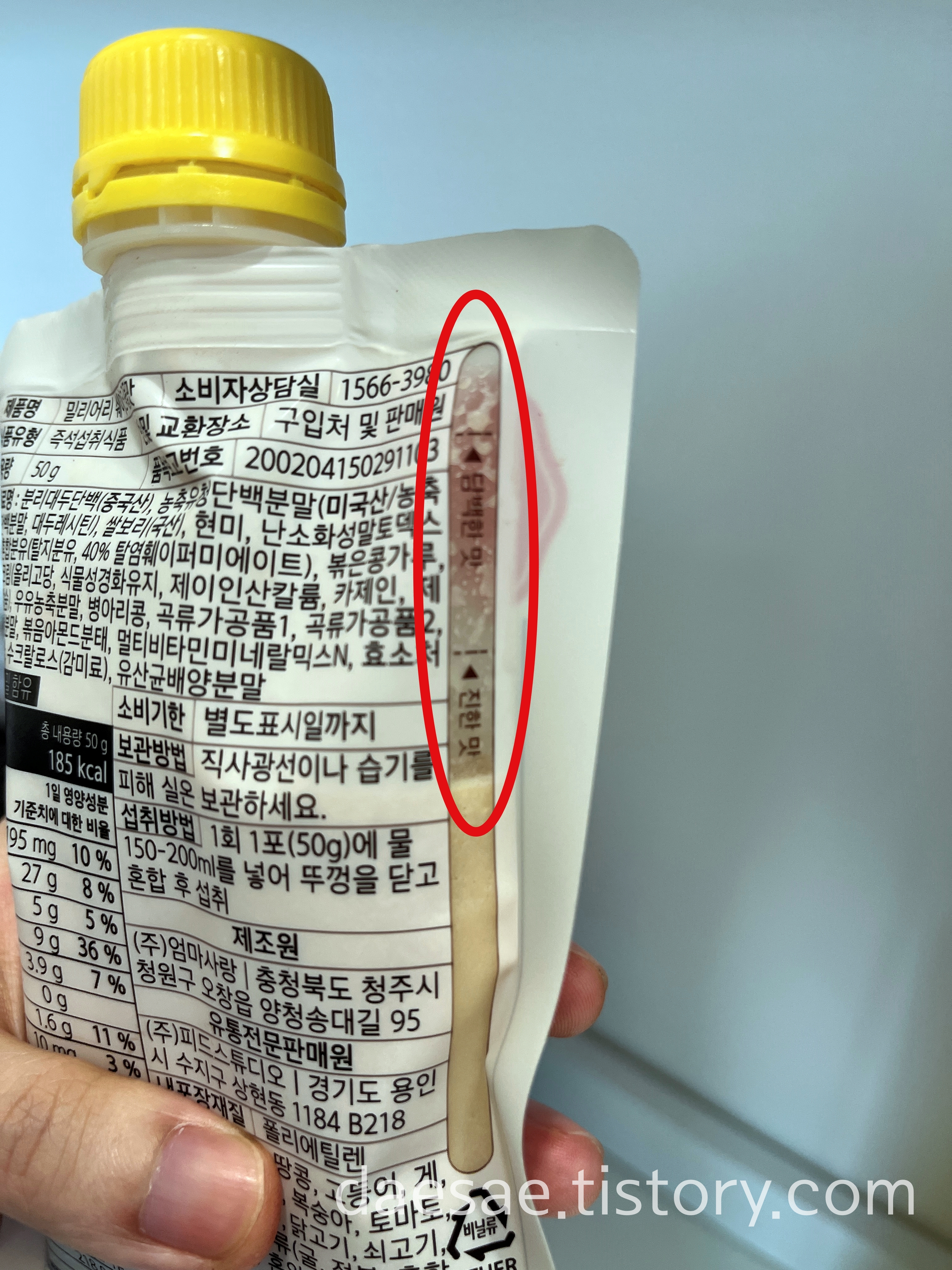 파우치 뚜껑을 열고 물을 안내선에 맞추어 넣은 뒤 흔들어 먹으면 끝입니다.