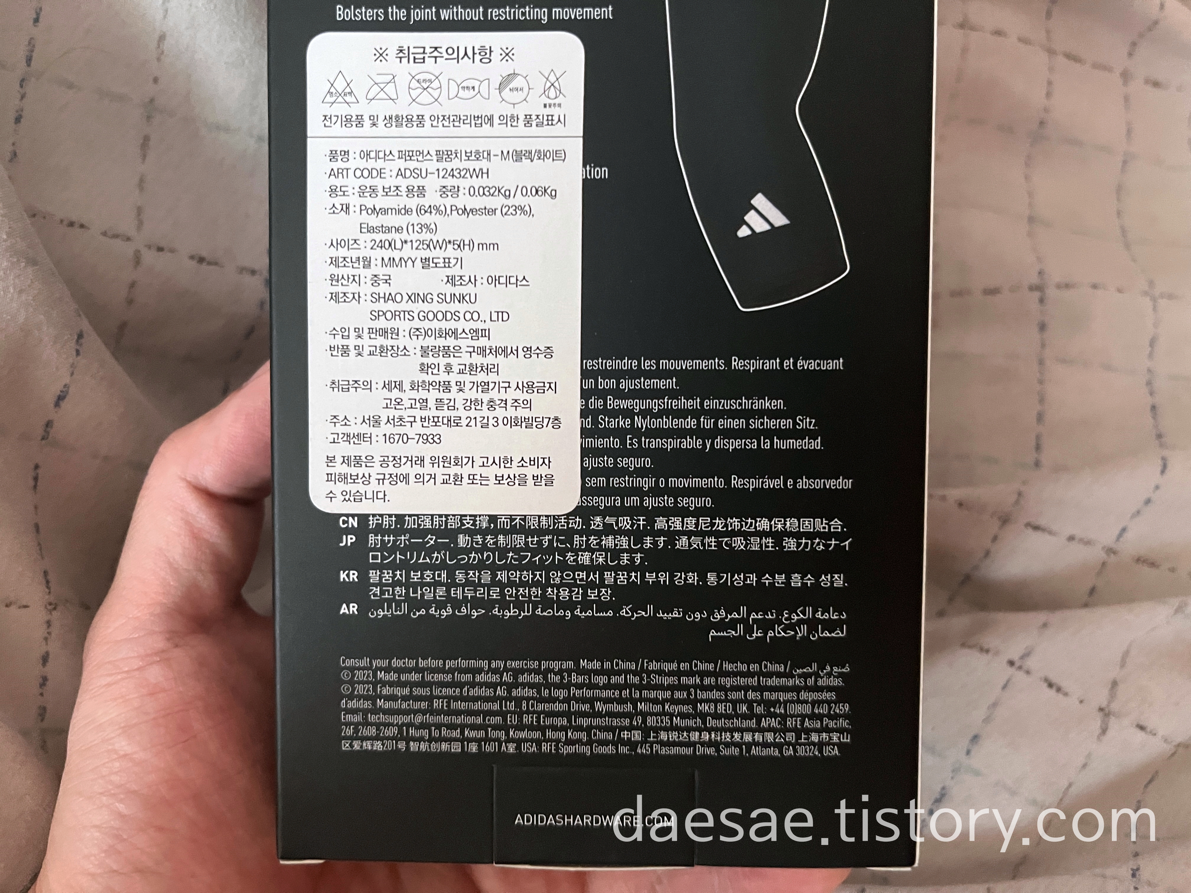 아디다스 퍼포먼스 팔꿈치 슬리브 박스 뒷면입니다.